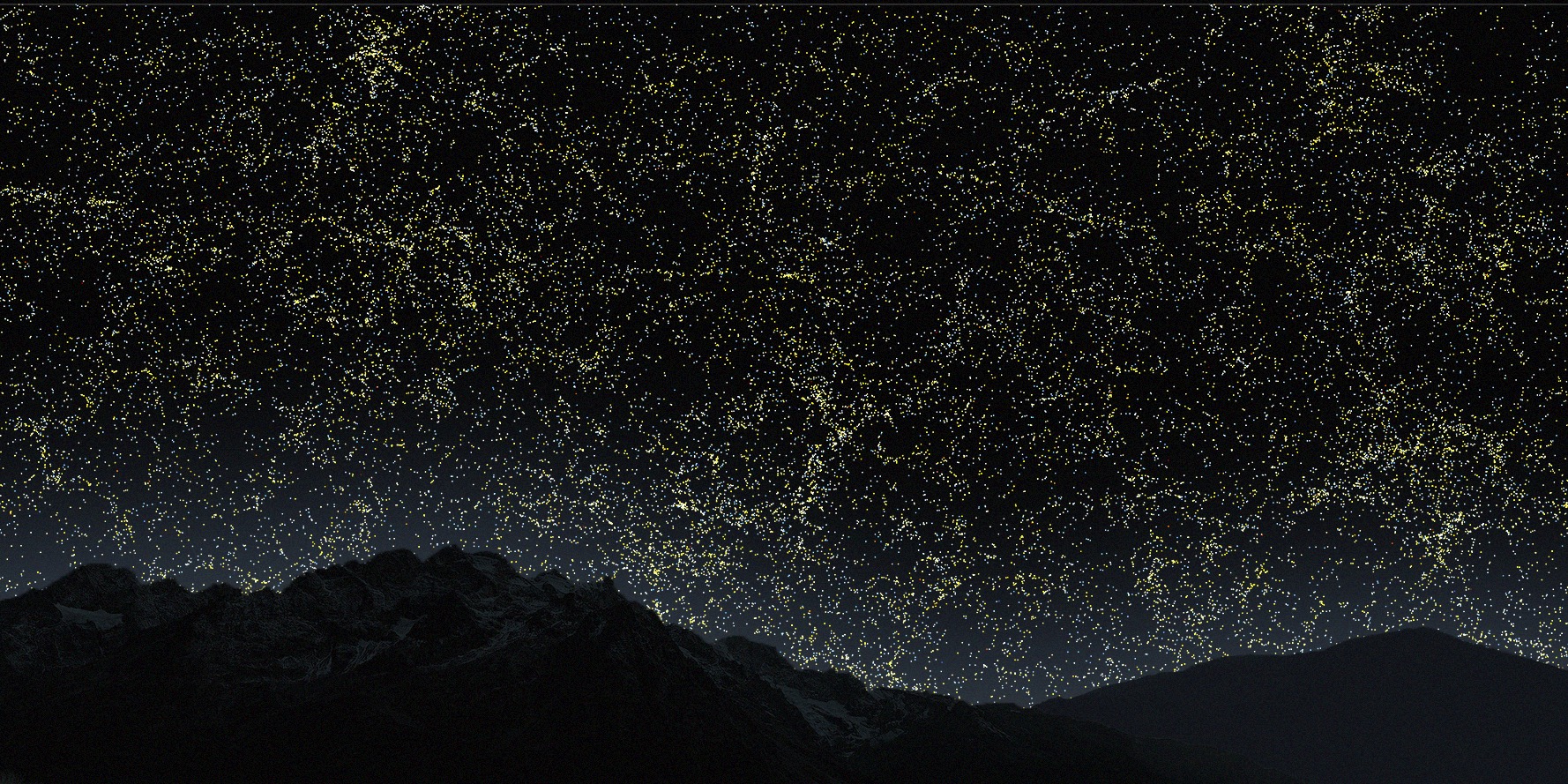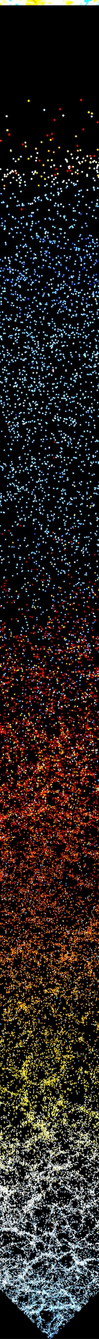 Each tiny dot is a galaxy. About 200,000 are shown with their actual position and color. Each galaxy contains billions of stars and planets. We are located at the bottom. Our galaxy, the Milky Way is just a dot. Looking up, we see that space is filled with galaxies forming a global filamentary structure. Far away from us (higher up in the map), the filaments become harder to see.