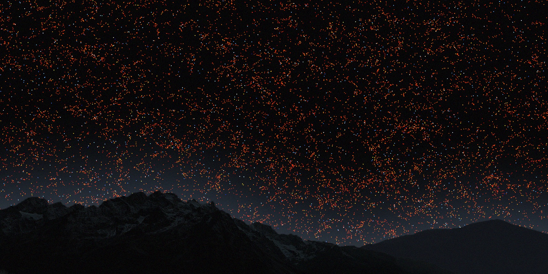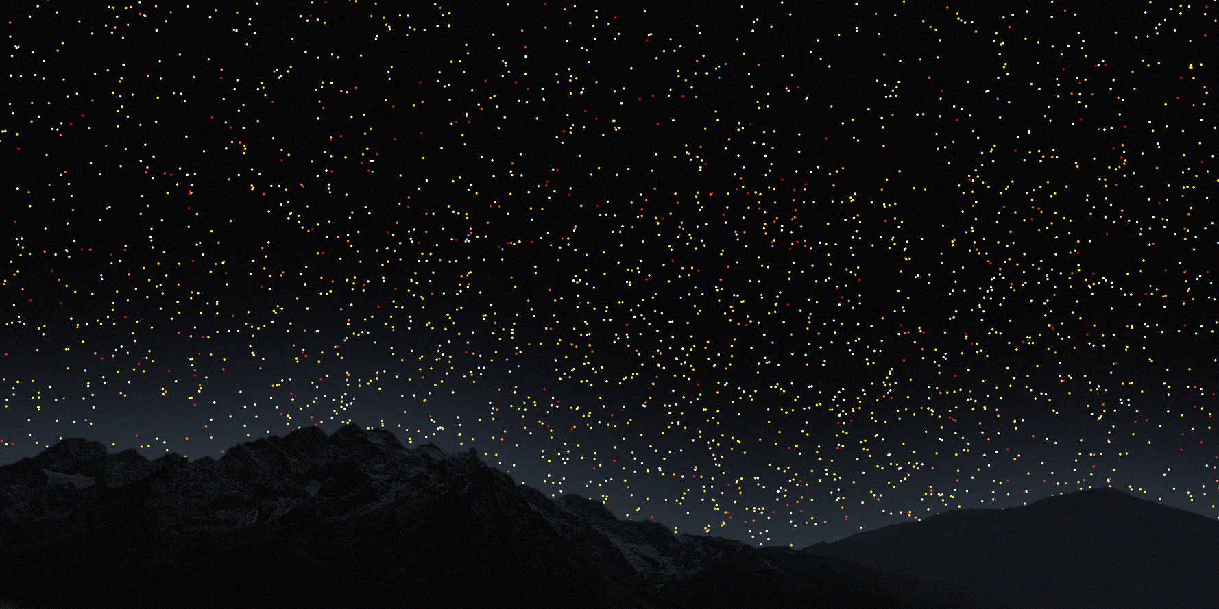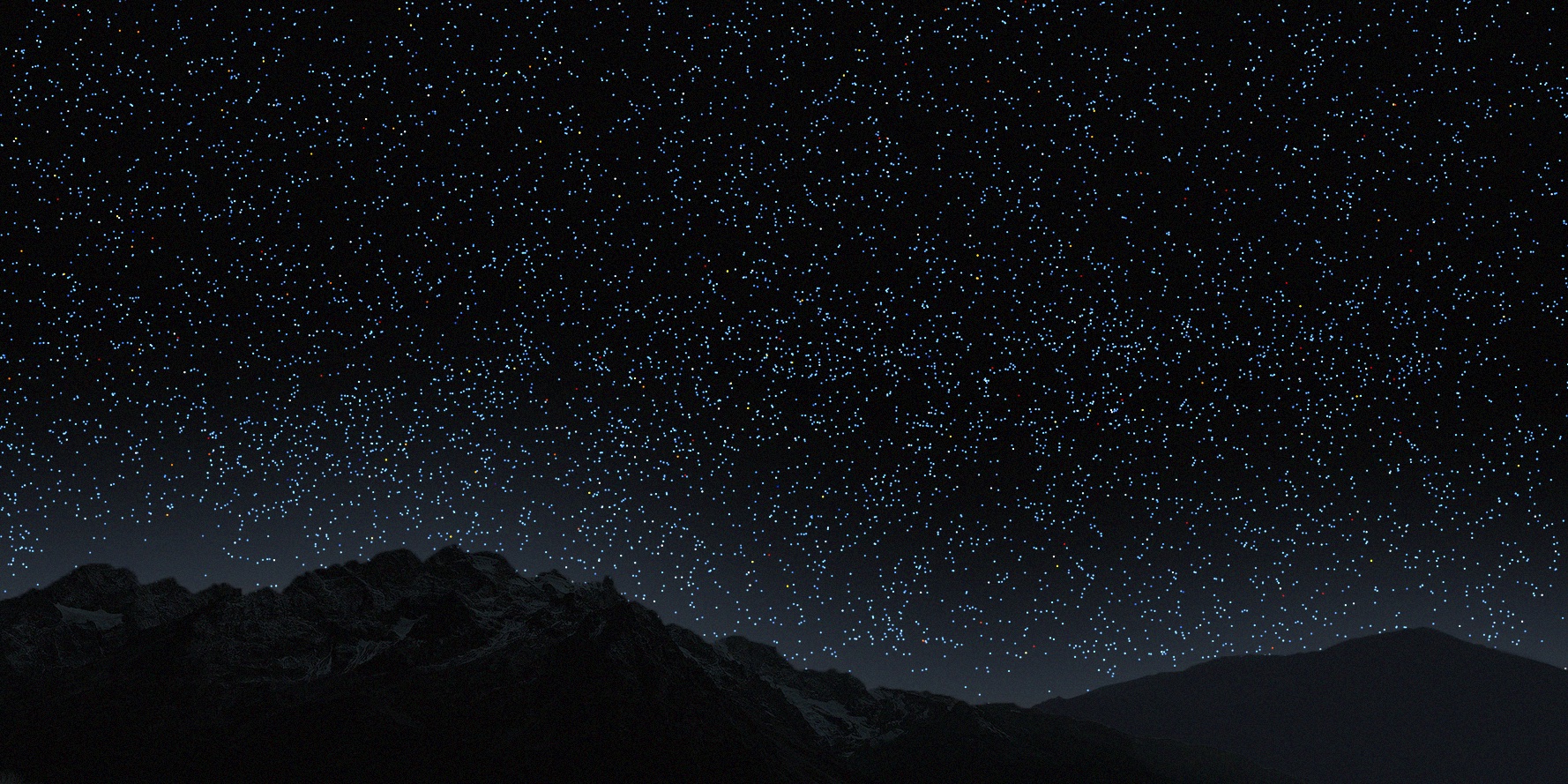 Each tiny dot is a galaxy. About 200,000 are shown with their actual position and color. Each galaxy contains billions of stars and planets. We are located at the bottom. Our galaxy, the Milky Way, is just a dot. Looking up, we see that space is filled with galaxies forming a global filamentary structure. Far away from us (higher up in the map), the filaments become harder to see.
